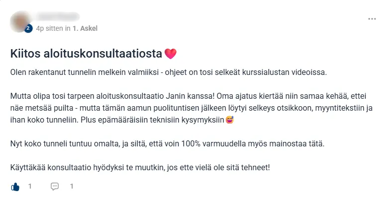 Todella hyvä ja kattava digitaalisen myynnin tuki uusasiakashankintaa tekevälle yrittäjälle. Opetusmateriaali on selkeää ja vaihe vaiheelta etenevät videot auttavat tekniikan kanssa. Arvostan päivittäitä mahdollisuutta livetapaamiseen, myös keskustelupalstan kautta saa hyvin tukea.