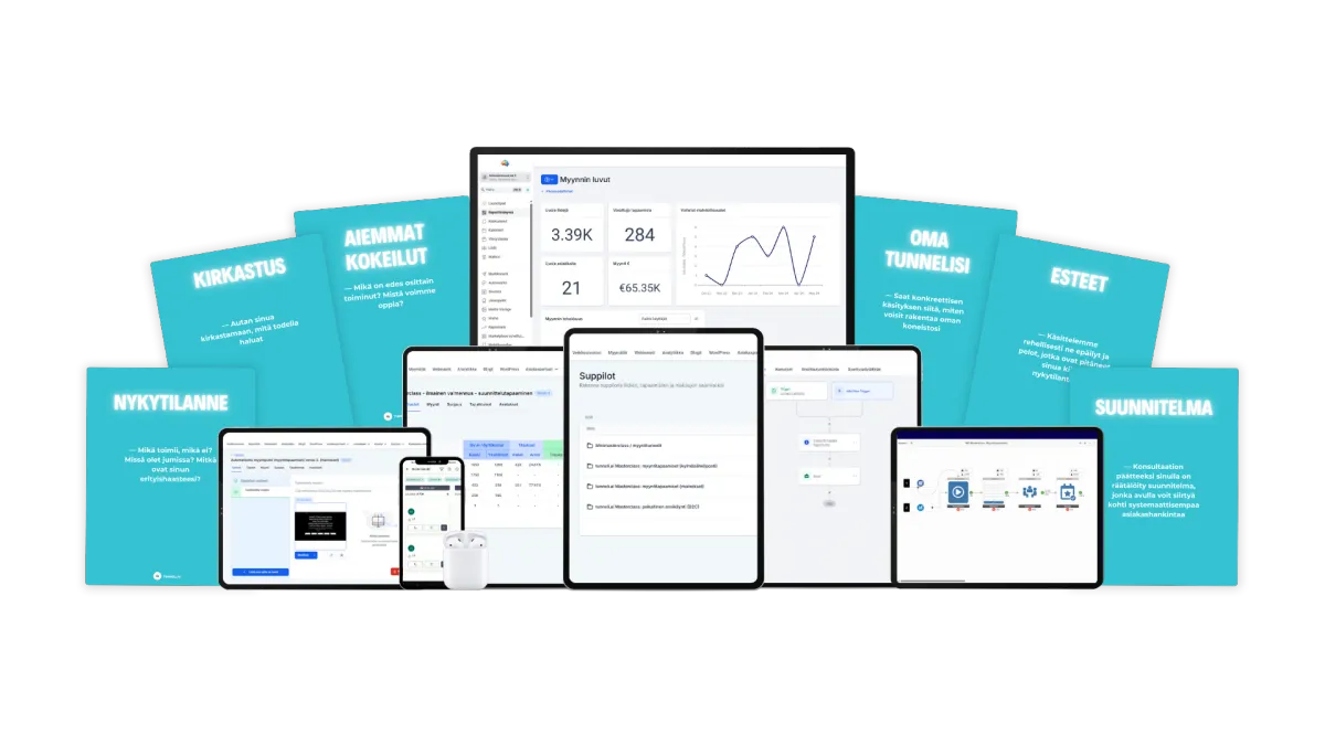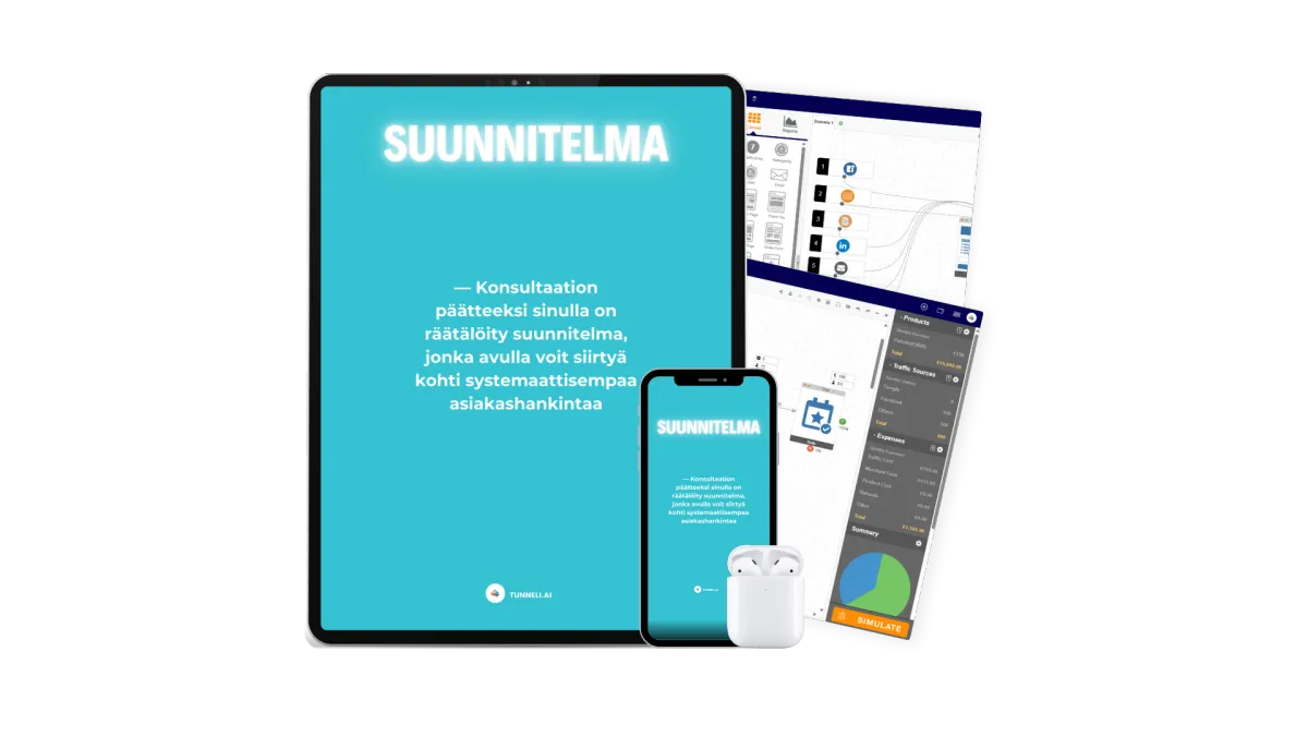 Realistisesti tuloksia alkaa näkyä 1-4 viikon kuluessa myyntitunnelin käyttöönototsta. Rakennusvaihe kestää tyypillisesti 2-8 viikkoa riippuen lähtötasostasi. Tämä ei ole pikaratkaisu, vaan kestävä järjestelmä. Ensimmäiset ajanvaraukset saattavat tulla jo muutamassa päivässä, mutta järjestelmän optimointi vie aikaa. Hyöty tässä onkin, että kun järjestelmä on kerran rakennettu oikein, se toimii vuosia eteenpäin tuoden jatkuvasti uusia asiakkaita ilman että joudut aloittamaan alusta. Tämä on kokonaisuus, jonka jokaista osaa voidaan mitata, optimoida ja johtaa.