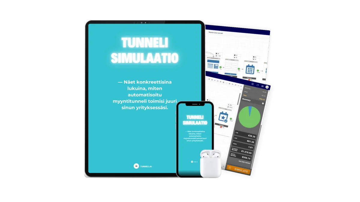 Näet konkreettisina lukuina, miten automatisoitu myyntitunneli toimisi juuri sinun yrityksessäsi. Tämä simulaatio perustuu 190+ asiakkaan todellisiin tuloksiin eri toimialoilla – ei arvailua vaan todelliseen dataan perustuva ennuste.