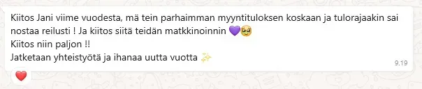 Jani on ylittänyt ja toimittanut kaikki lupaukset ja odotukset. Aluksi homma kuulosti aivan liian hyvältä ollakseen totta enkä aikonut antaa aikaani edes aloitus puheluun. Onneksi Jani oli sinnikäs ja luottaa omaan tuotteeseensa sillä hän on pelastanut mun mentaalisen hyvinvoinnin sekä yrityksen sillä tämä konsepti todellakin toimii. Olen ikuisesti kiitollinen ja niin tyytyväinen asiakas, että haluan jatkaa tätä yhteistyötä niin pitkään kuin mahdollista!