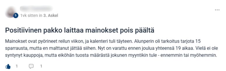 Todella hyvä ja kattava digitaalisen myynnin tuki uusasiakashankintaa tekevälle yrittäjälle. Opetusmateriaali on selkeää ja vaihe vaiheelta etenevät videot auttavat tekniikan kanssa. Arvostan päivittäitä mahdollisuutta livetapaamiseen, myös keskustelupalstan kautta saa hyvin tukea.