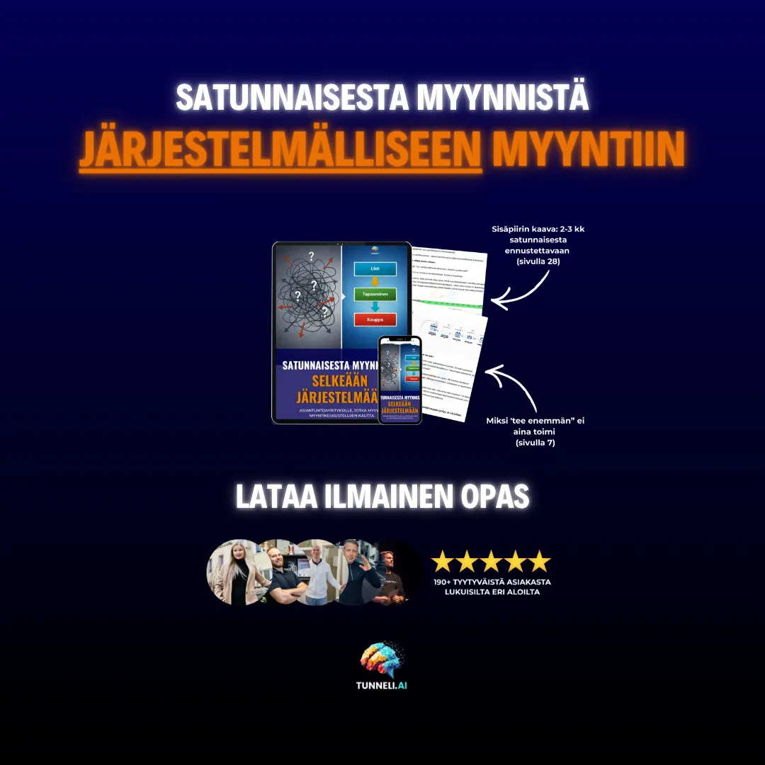 Maksuttoman oppaan avulla näet konkreettiset vaiheet, joilla asiantuntijayritykset ovat rakentaneet myynnistä yksinkertaisen ja johdettavan järjestelmän.
