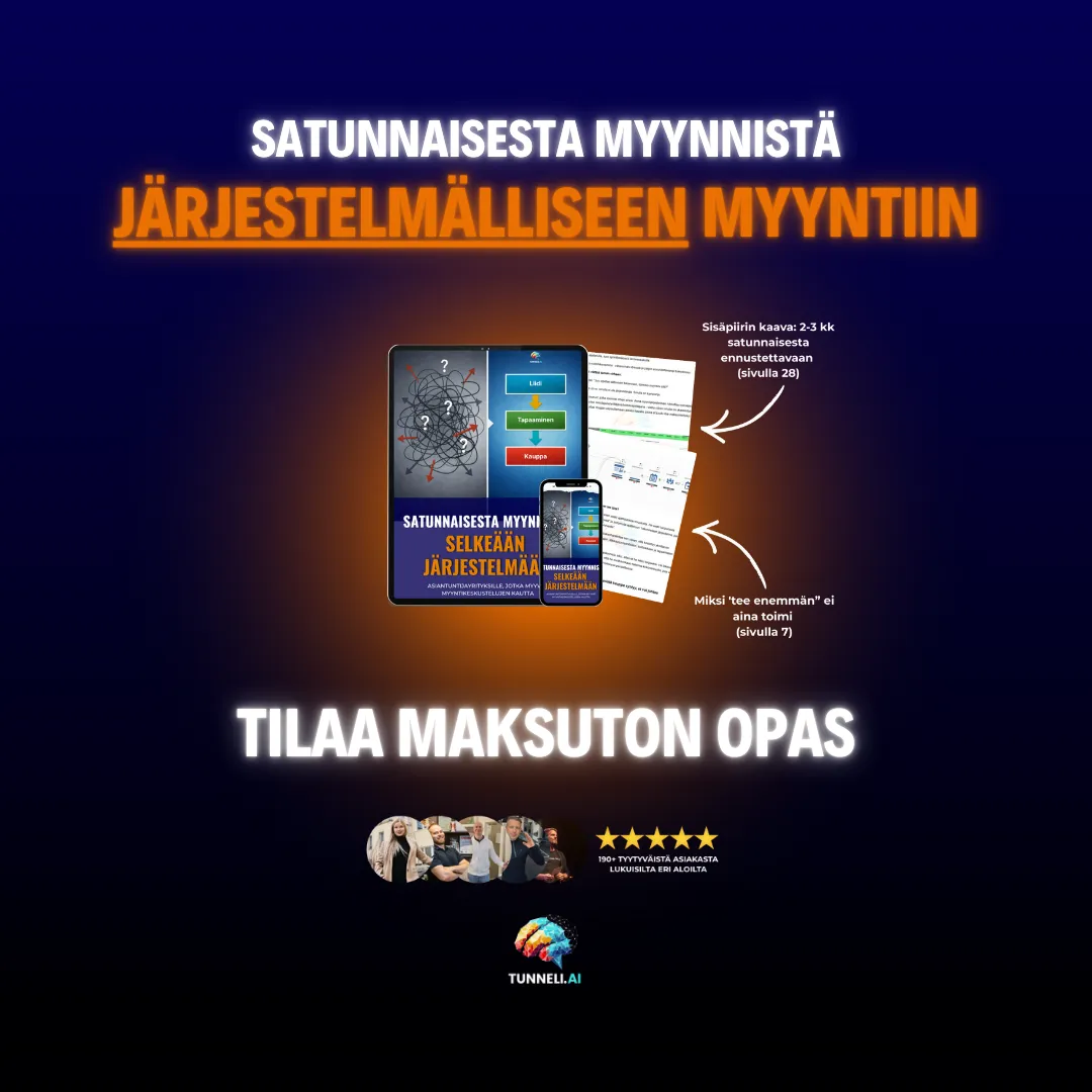 Lyhyesti: Tämä opas on tarkoitettu asiantuntijayrityksille, jotka haluavat ymmärtää, miksi myynti ei ole koskaan muuttunut ennustettavaksi – ja miten se rakennetaan järjestelmäksi.